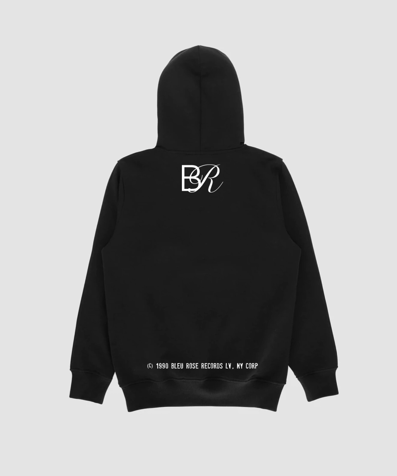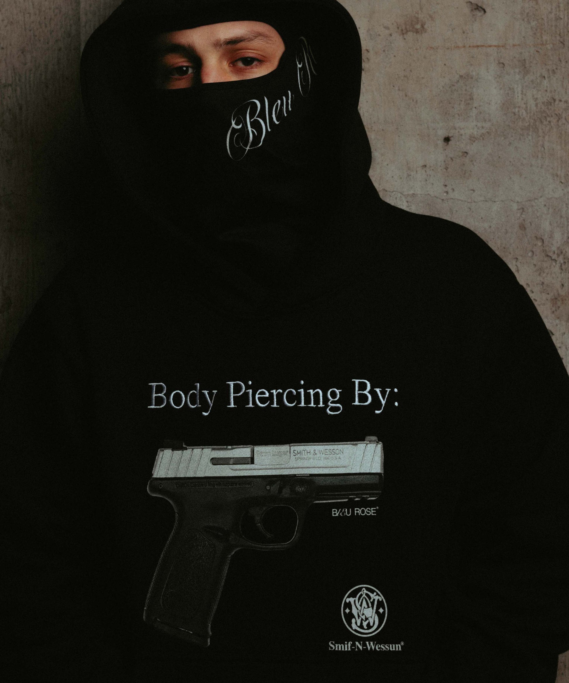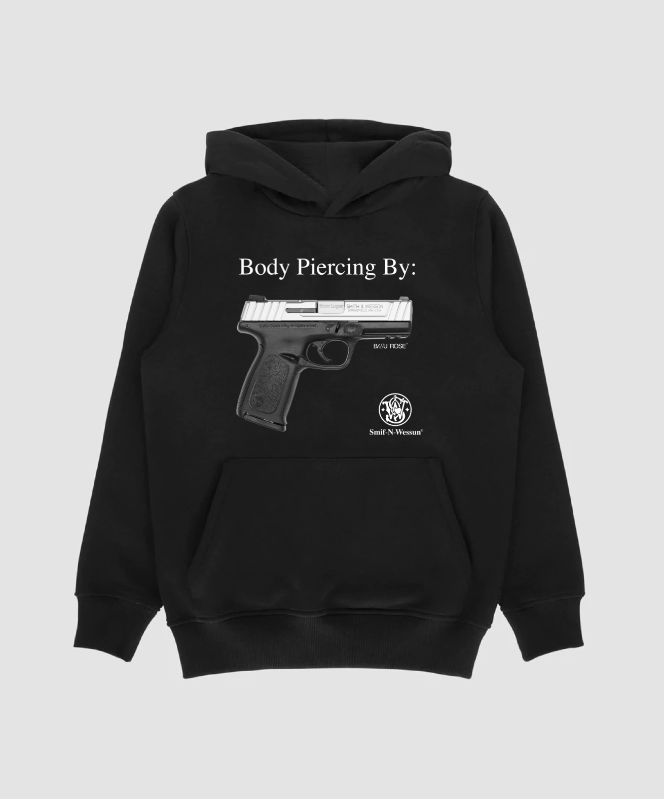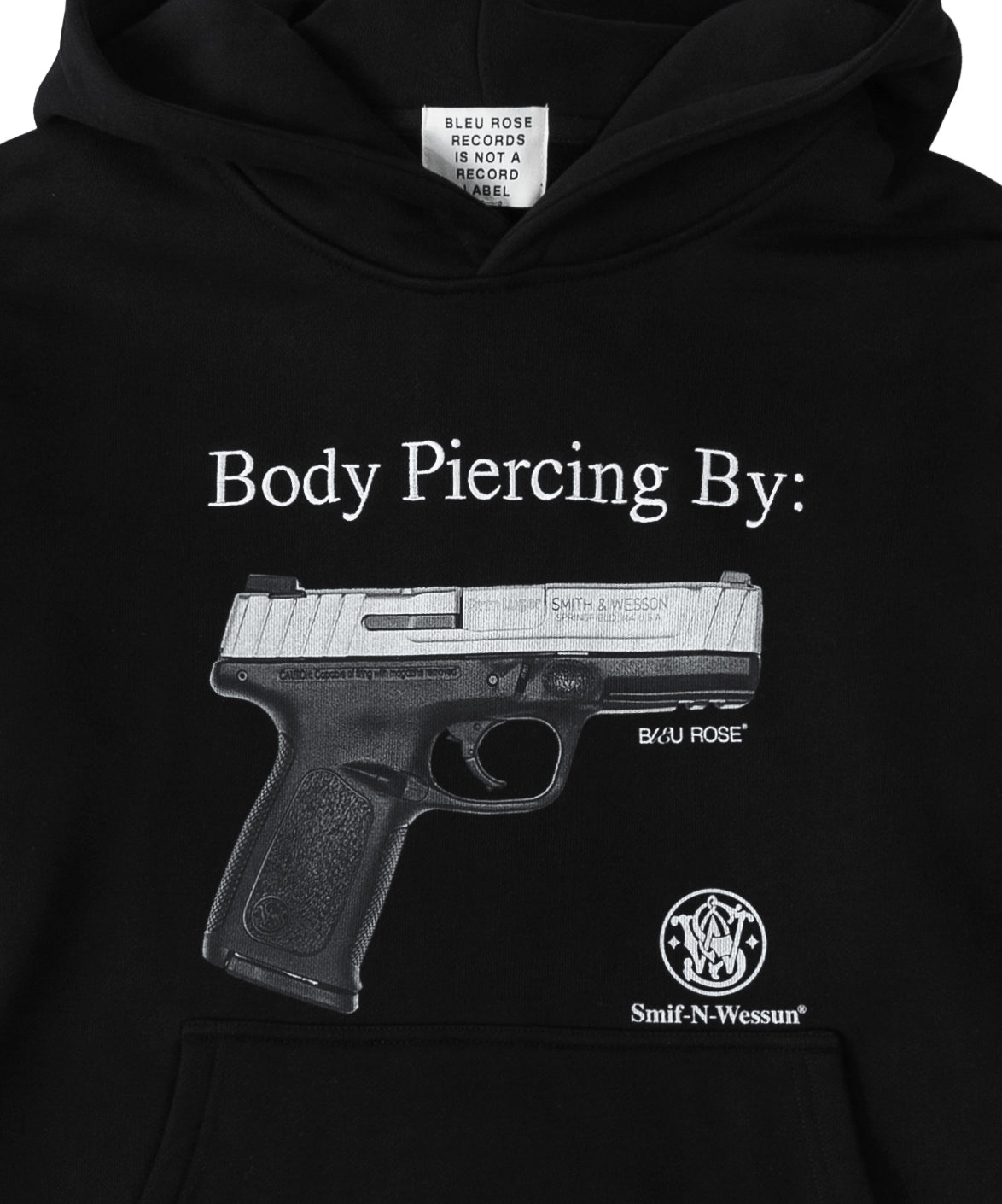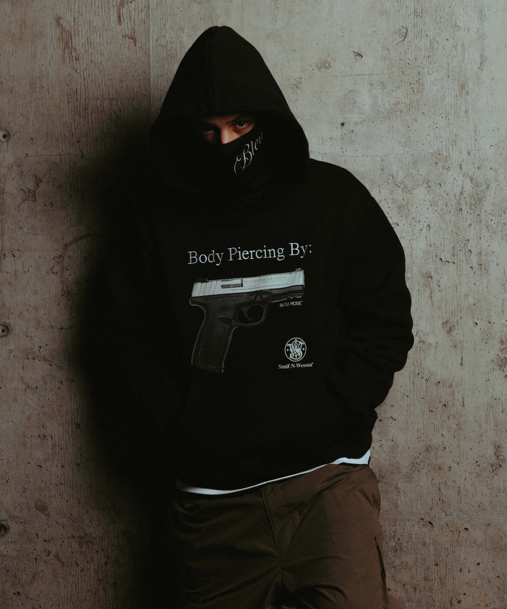 Heavyweight (460gsm) brushed french terry hoodie with “Silver 9MM Luger” artwork at front. Embroidered "Body Piercing By" text. Monogram and recording stamp signature print at back. Smif-N-Wessun.