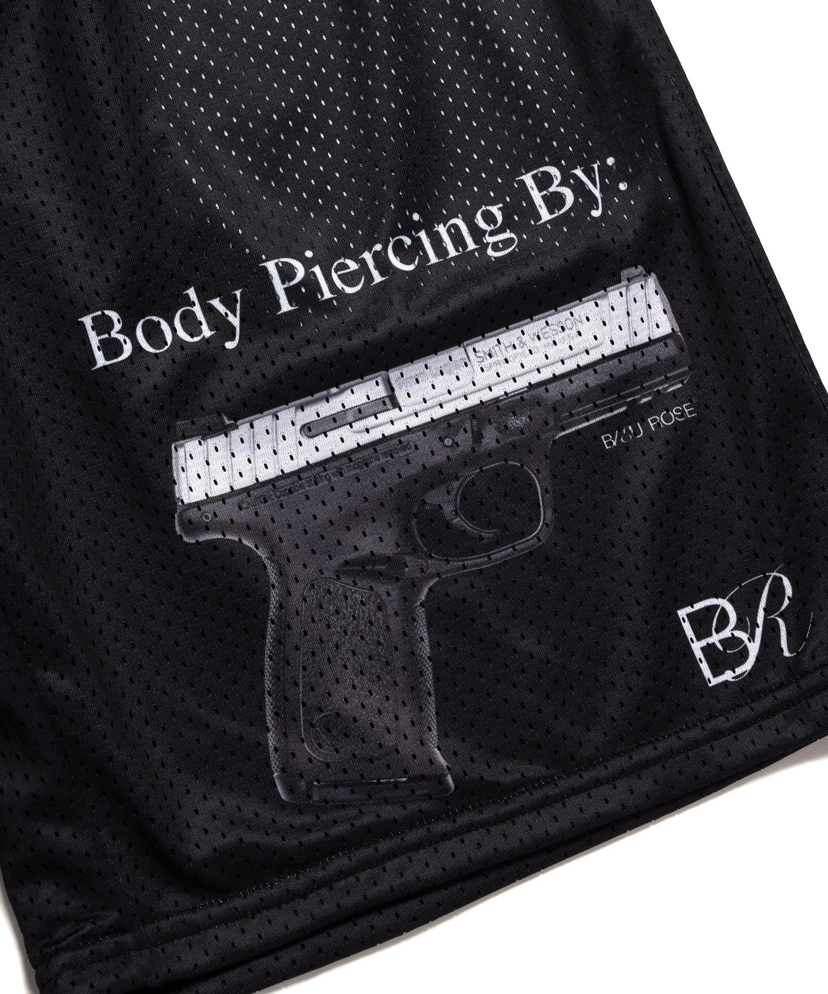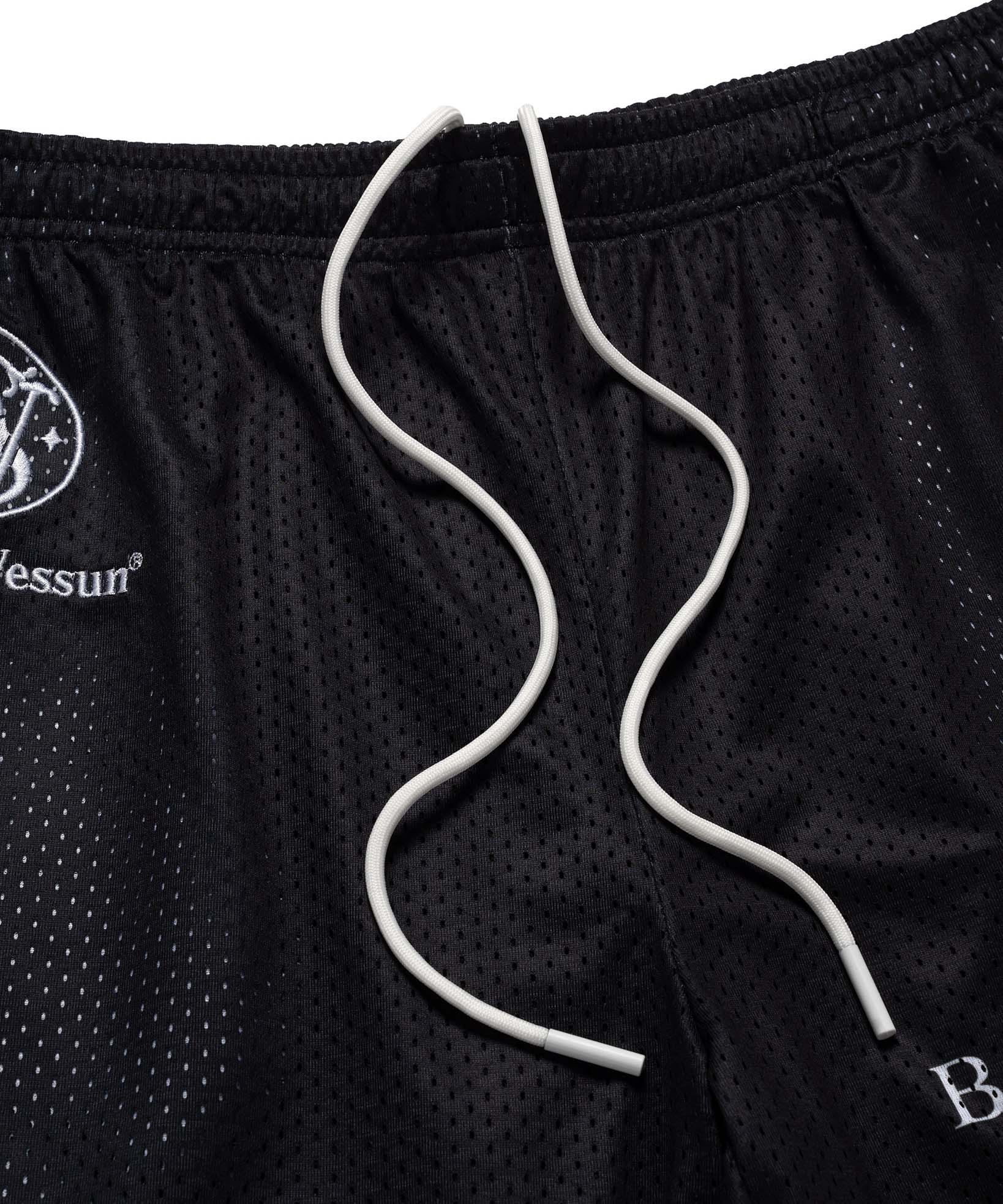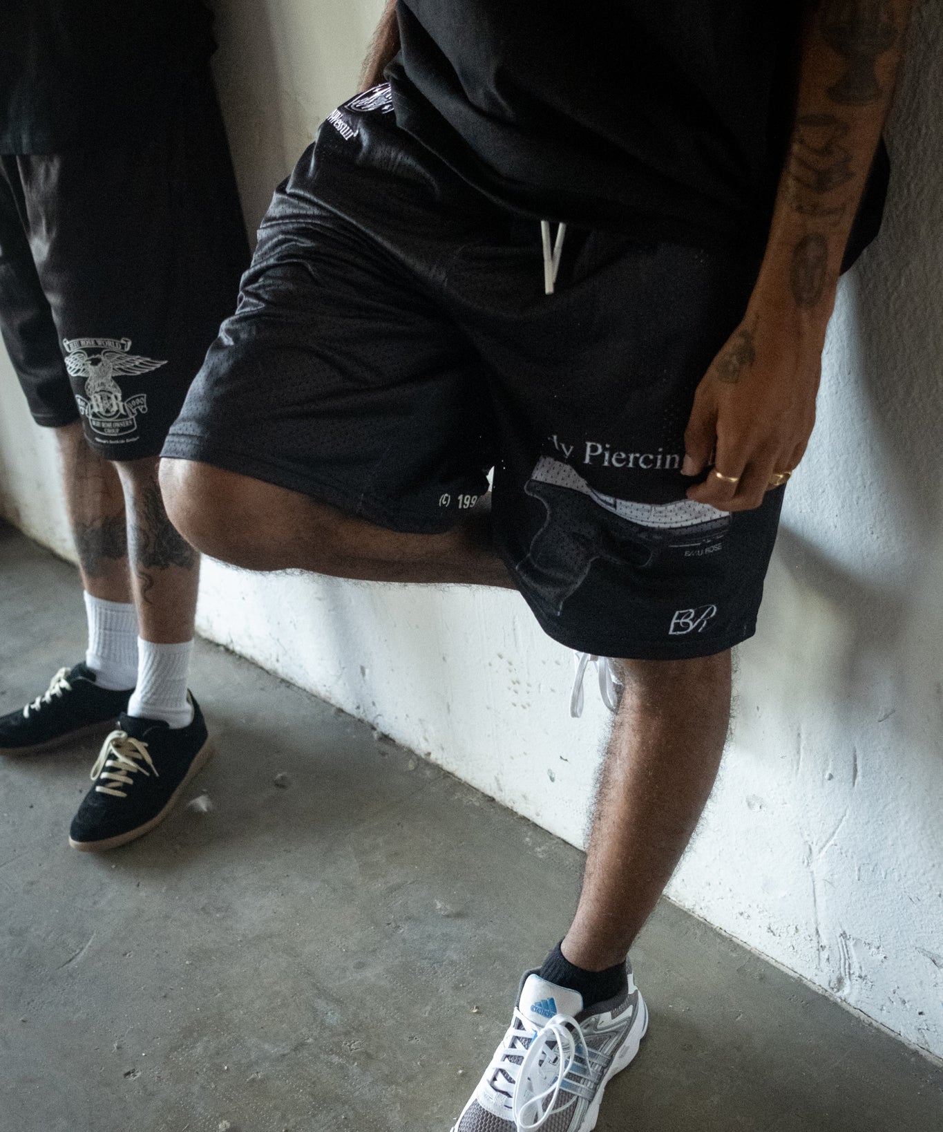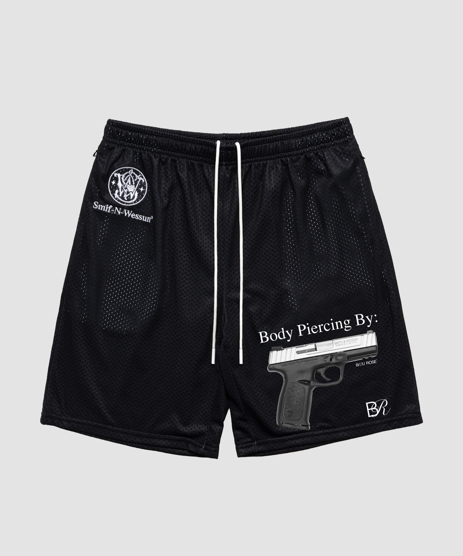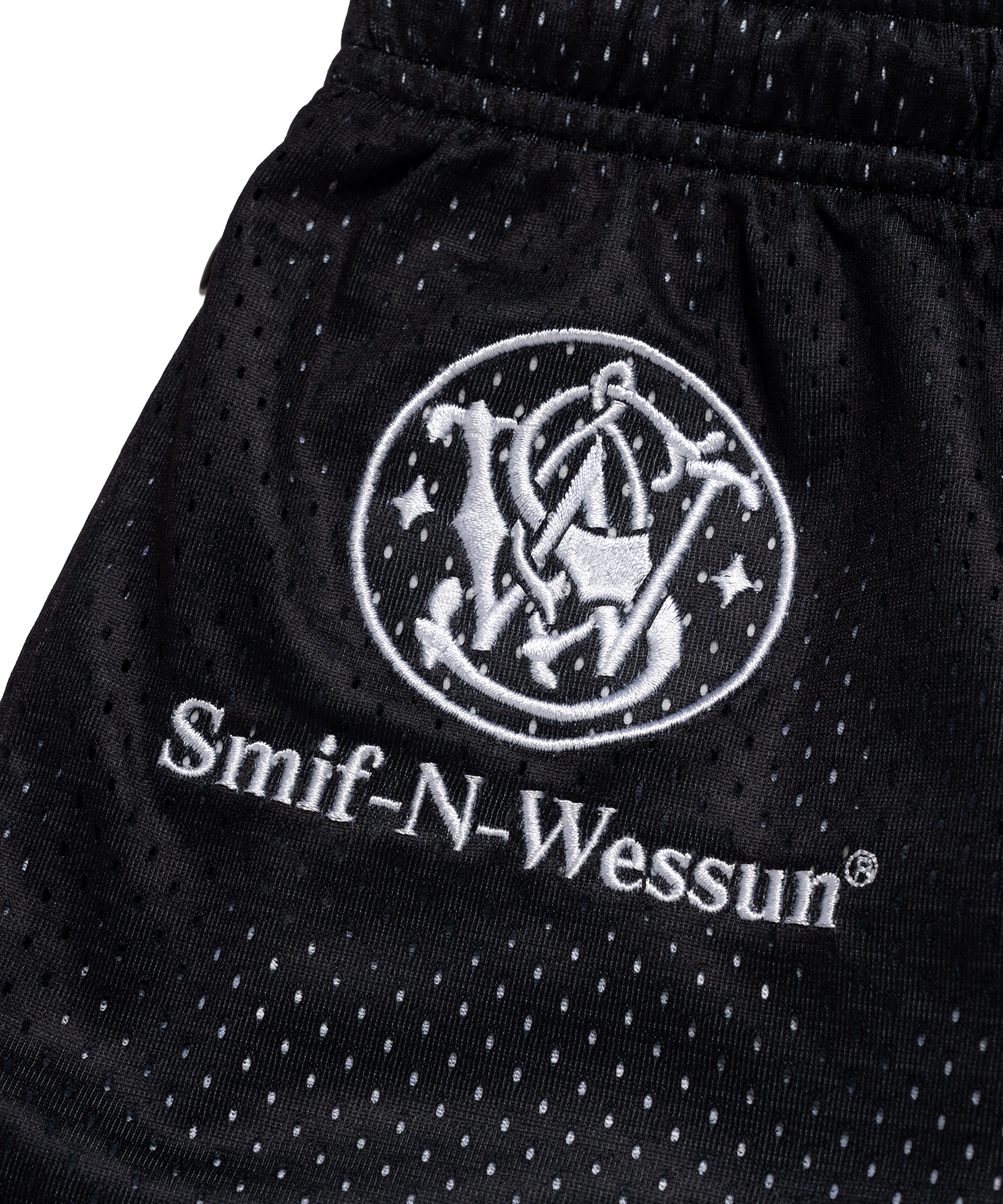 Mid-weight lined mesh shorts featuring "Silver 9MM Luger" artwork on the front. Embroidered "S&W" logo near the waistband. Recording signature print on the back. Equipped with hidden zip pockets and a drawstring waistband. Smif-N-Wessun.