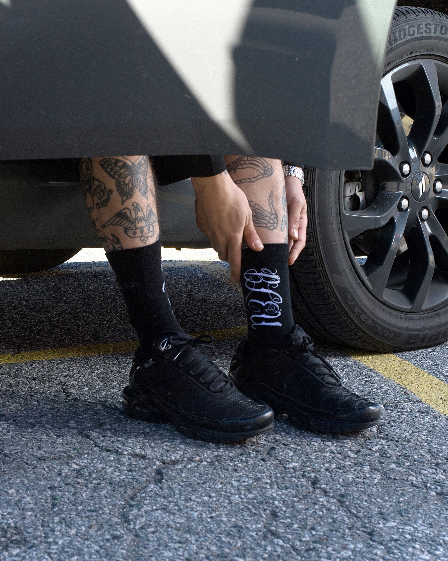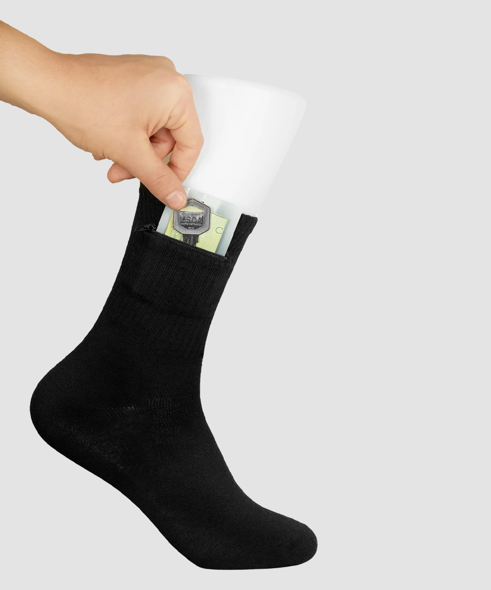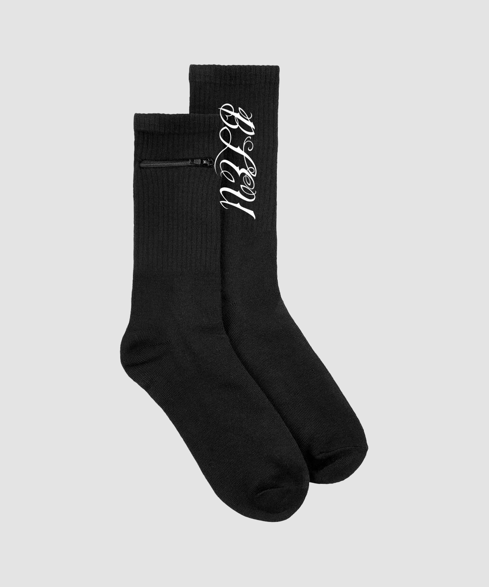 Cotton blend socks with a unique zip pocket feature. Scripture logo on internal side of sock.
