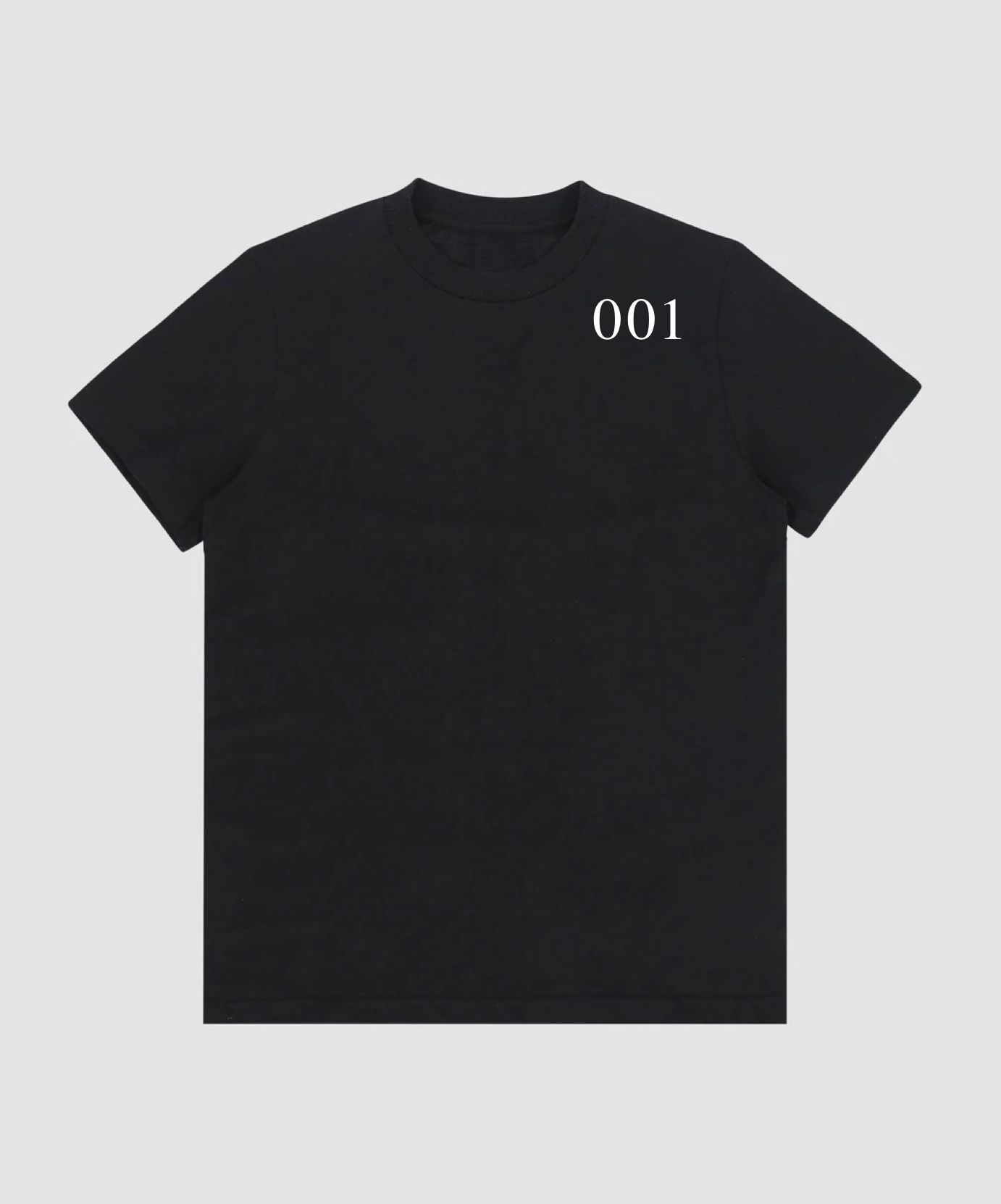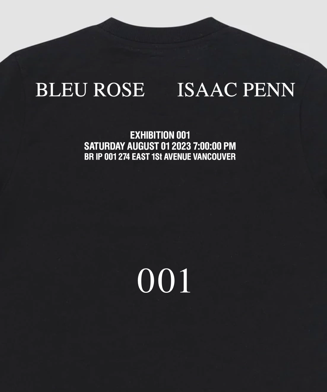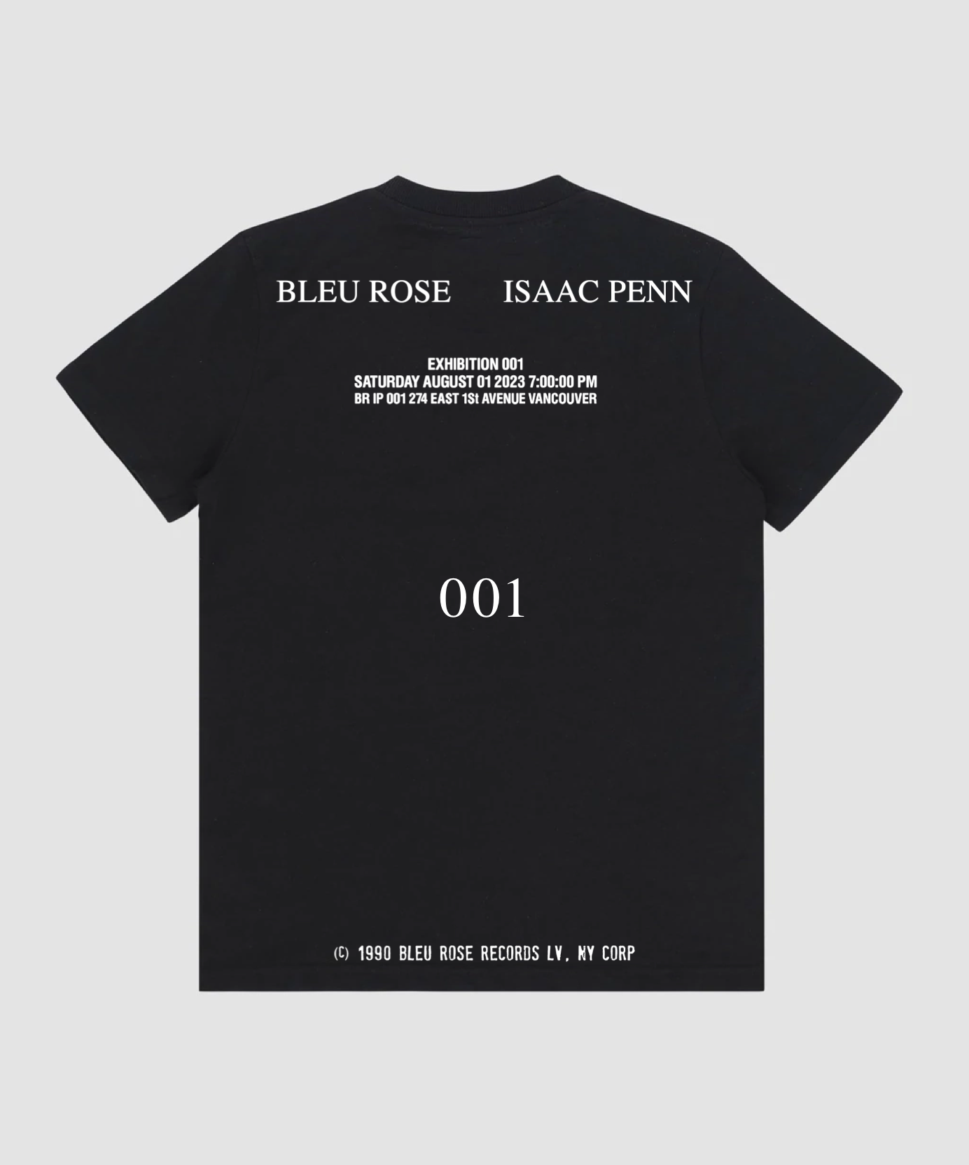 Mid-weight t-shirt with “001” artwork top right at front. “Exhibition 001” and recording stamp signature print at back. Limited edition.