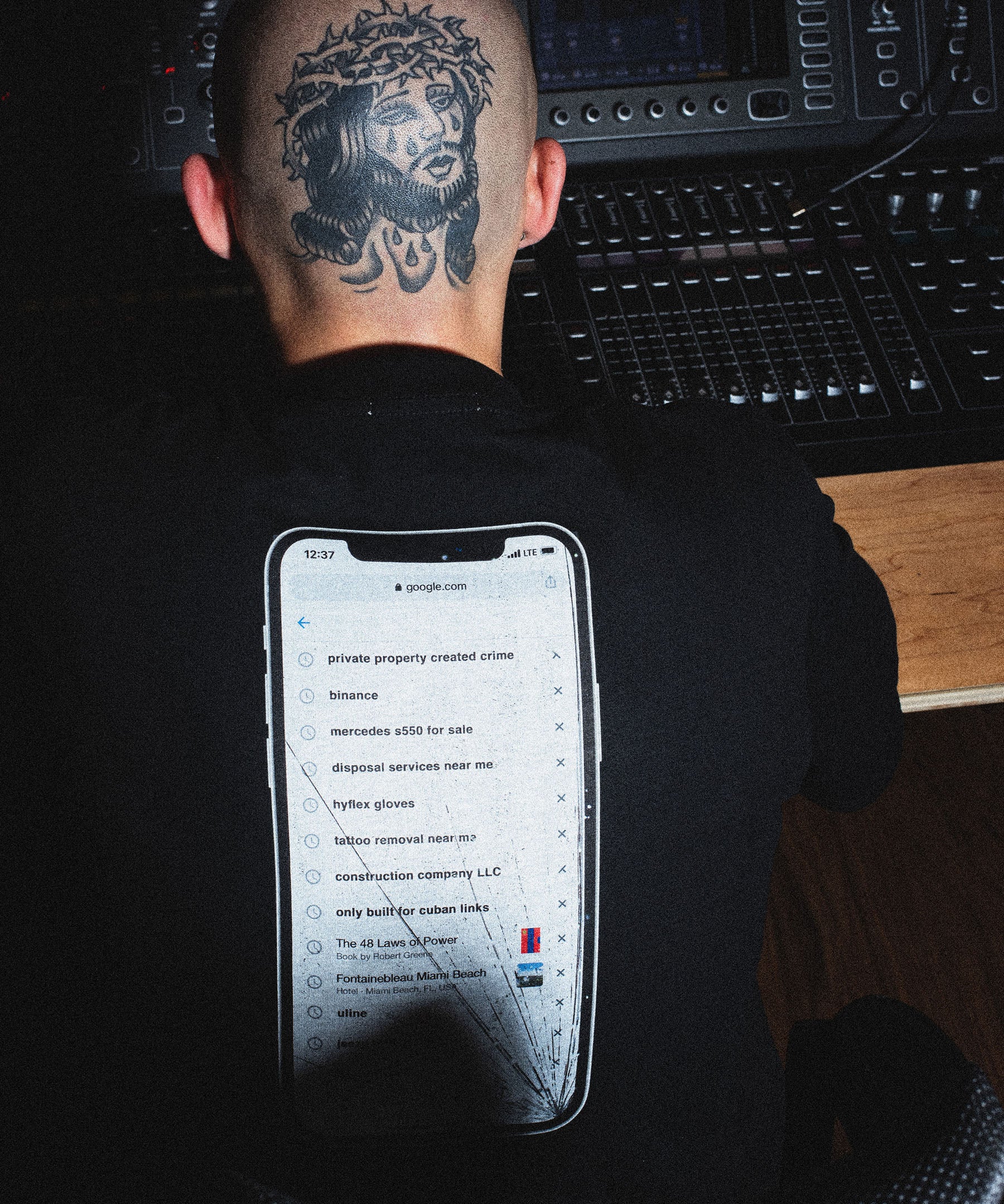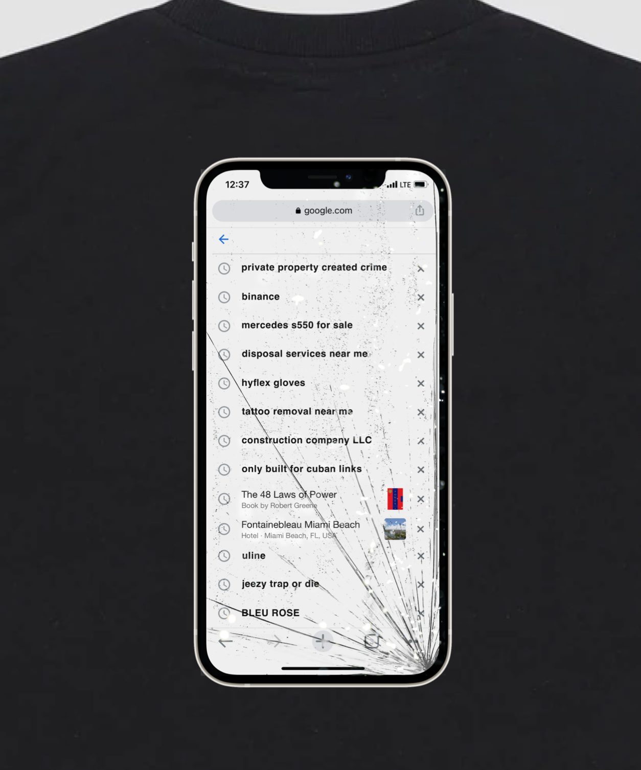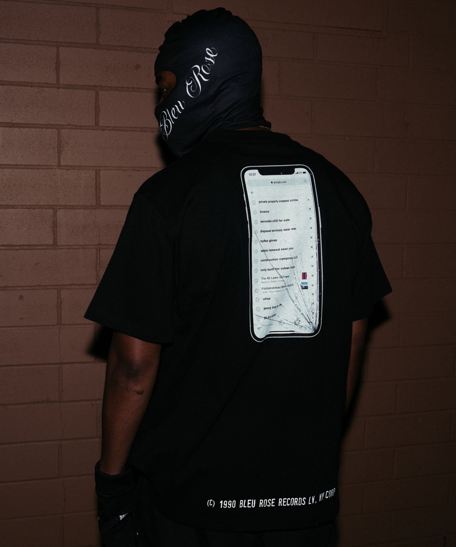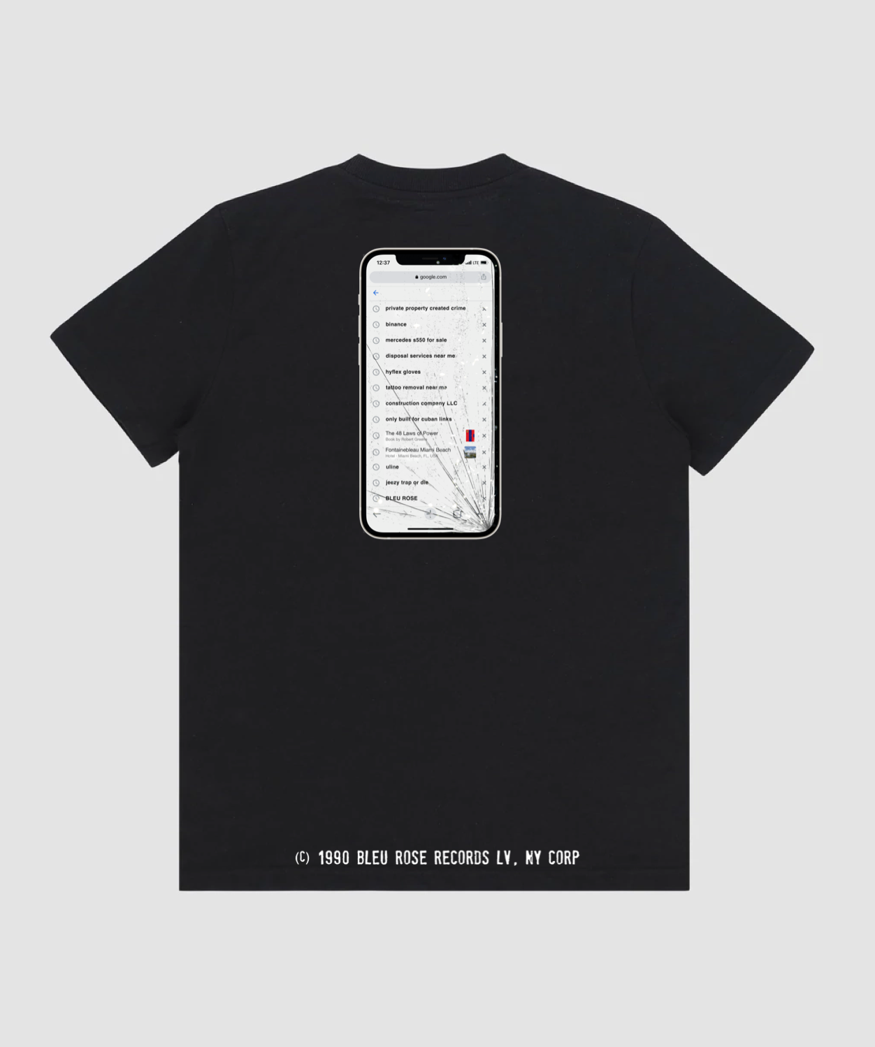 Mid-weight t-shirt with monogram at front. “Cracked iPhone Search Engine” artwork and recording stamp signature print at back. Crack residue.